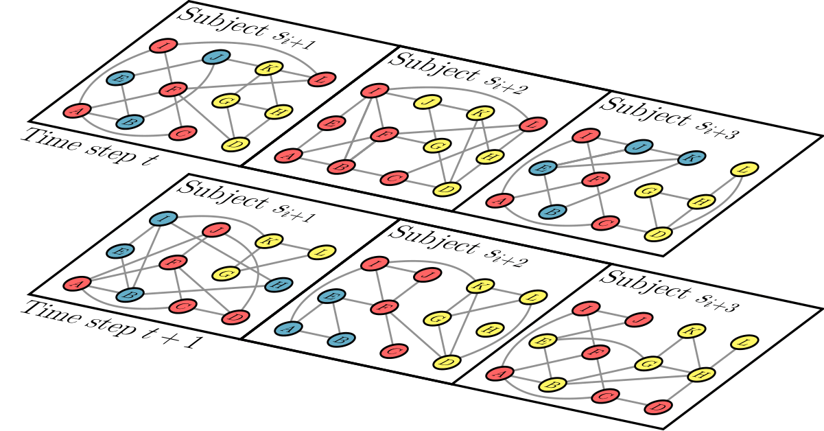 We published a paper in Bioinformatics. In this paper, we developed a new approach for community detection in multi-subject and dynamic networks, in particular networks constructed from scRNA-seq data. The abstract is given below, and see the figure for an illustration of what multi-subject and dynamic networks refer to.